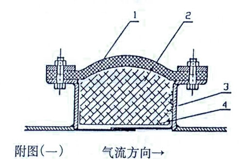 非金屬補(bǔ)償器是由:(1)非金屬?gòu)?fù)合圈帶 (2)隔熱填料層 (3)機(jī)架 (4)不銹鋼絲網(wǎng)等組成。見附圖(一)。