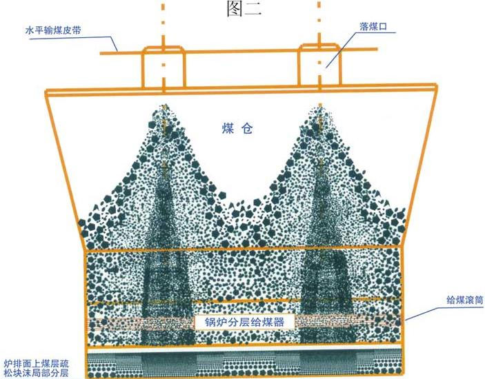 鍋爐混煤機是針對機械聯(lián)合輸送上煤方式鍋爐,單獨使用鍋爐分層給煤器效果不好其原因(如圖二),近年來研發(fā)的產(chǎn)品,其作用相當于建筑用砂漿攪拌機,將由輸煤皮帶上自然下落進入煤倉形成塊、沫分離的煤進行攪拌混合,根據(jù)單位時間煤耗量利用變頻器調(diào)整轉(zhuǎn)速,使塊、沫和干、濕度(配套均勻加水裝置)充分混合均勻。